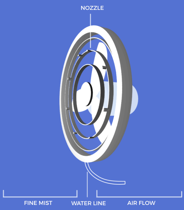 SimplyCool products create, through high pressure, a very fine water misting vapor (or fog). As the fan blows air, the vapor completely flash evaporates. This action requires energy, which is obtained by drawing heat out of the air. The result is dramatically cooled air, reducing temperatures in the immediate area by up to 25° F (14° C), even in direct sunlight. Complete evaporation assures no wetting of people or environment. SimplyCool products simply attach to a fresh source of water, like a spigot with a garden hose or indoor faucet. Most cooling systems use a ‘misting’ system which doesn’t use our innovative high-pressure impeller nozzles, resulting in larger water droplets, which don’t evaporate. These basically end up spraying water onto everyone and everything.